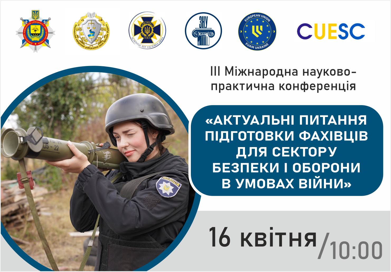 16 квітня 2026 року Донецький державний університет внутрішніх справ спільно з Національним юридичним університетом імені Ярослава Мудрого, Інститутом Служби безпеки України Національного юридичного університету імені Ярослава Мудрого, Запорізьким національним університетом, Консультативною місією Європейського Союзу, Центром українсько-європейського наукового співробітництва запрошує взяти участь у ІІІ Міжнародній науково-практичній конференції «АКТУАЛЬНІ ПИТАННЯ ПІДГОТОВКИ ФАХІВЦІВ ДЛЯ СЕКТОРУ БЕЗПЕКИ І ОБОРОНИ В УМОВАХ ВІЙНИ»