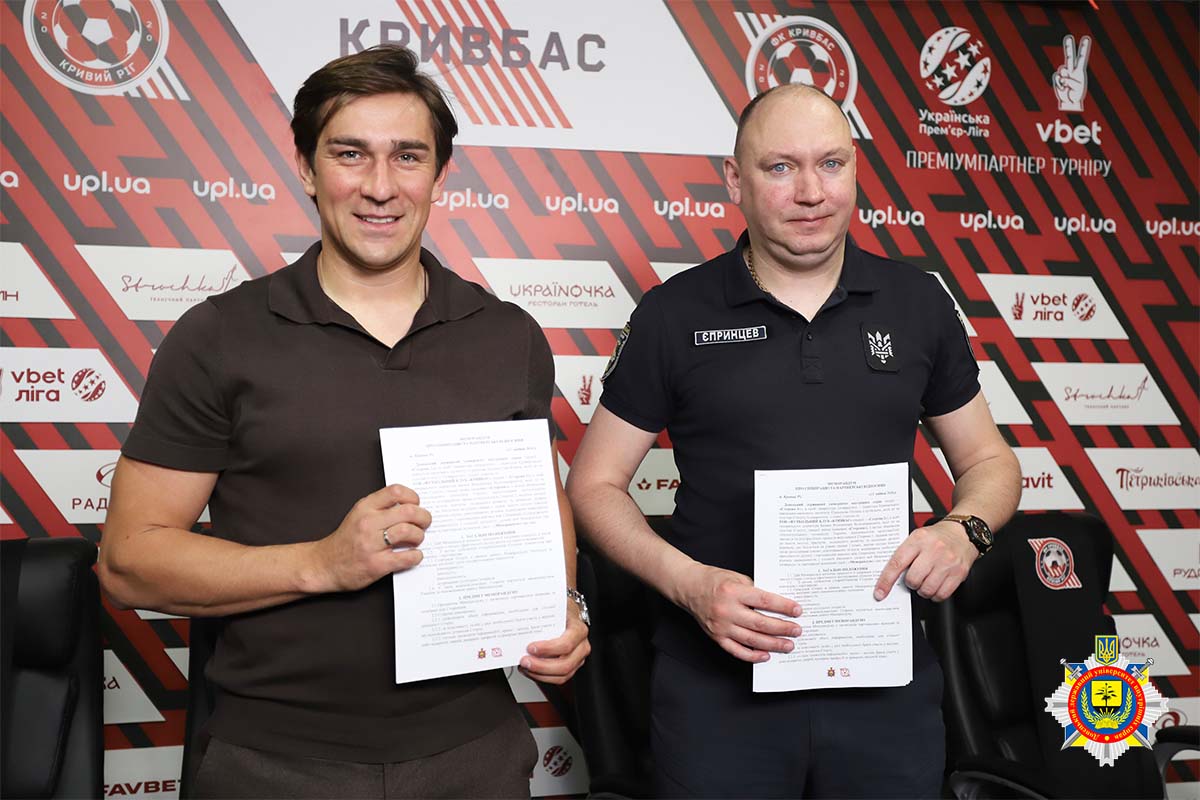 Відбулася зустріч проректора університету – директора Криворізького навчально-наукового інституту ДонДУВС Пилипа Єпринцева та генерального директора ТОВ «ФУТБОЛЬНИЙ КЛУБ «КРИВБАС» Володимира Баєнка. Керівники обговорили напрями співпраці та підписали меморандум.