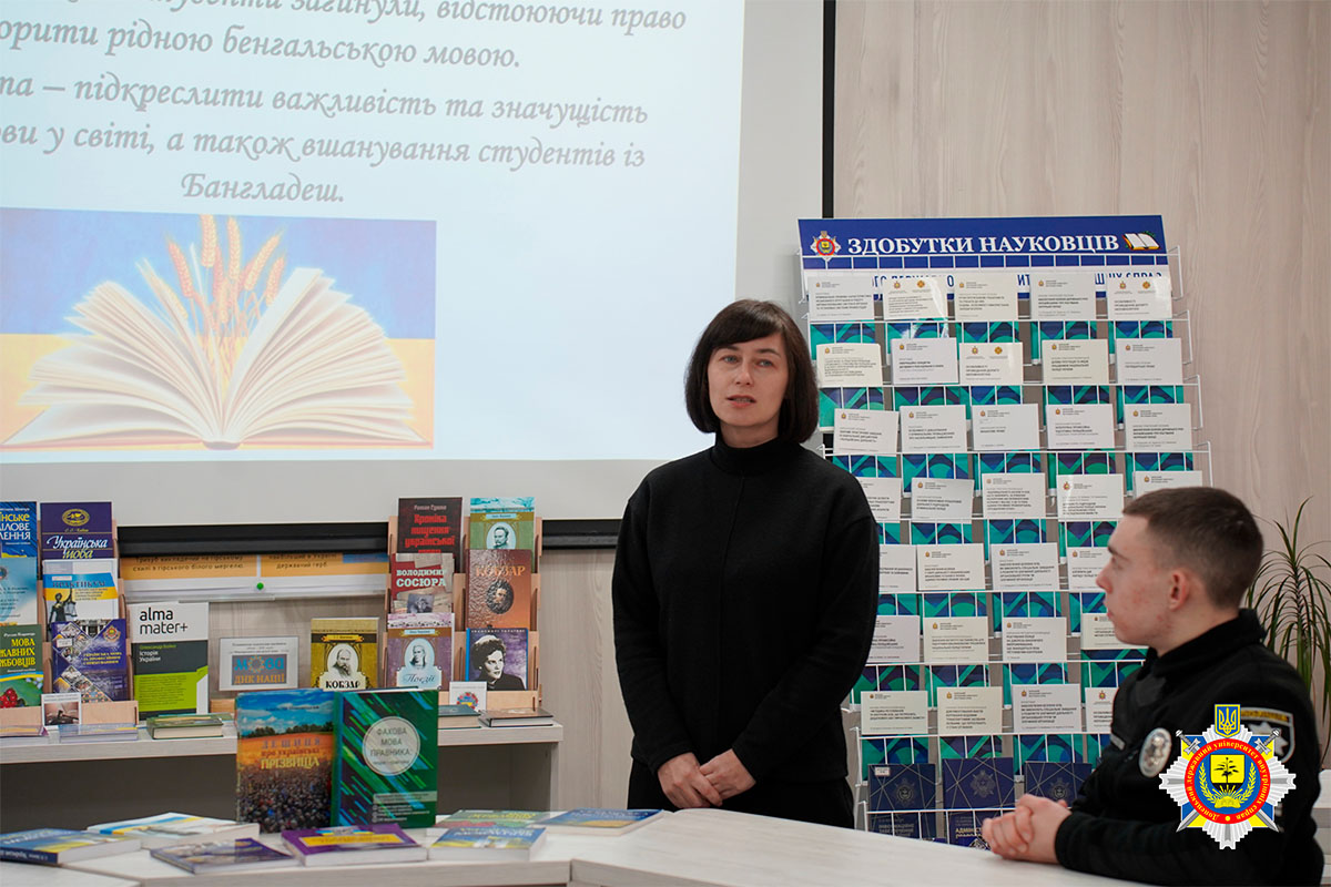 Бібліотекарка Тетяна Завалєй розповіла про історію свята, наголосивши, що мова є духовним кодом нації, її пам’яттю та силою. Також вона представила тематичну книжкову виставку «Мова – ДНК нації».